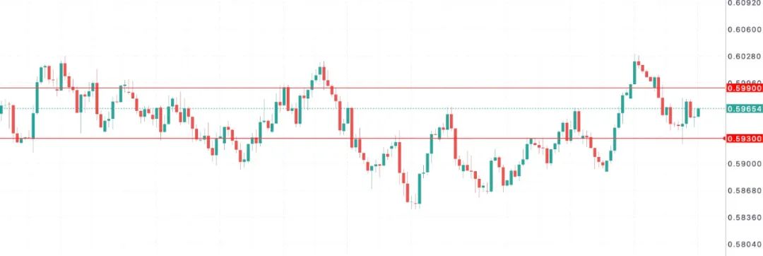而多头位于0.5930区域构建强力防御主线。尽管在纽币短线突破该区域防线后或触发下探0.5900区域风险,但在其收盘价格站稳至0.5930区域下方后,短期价格走势才有望转向看空结构。